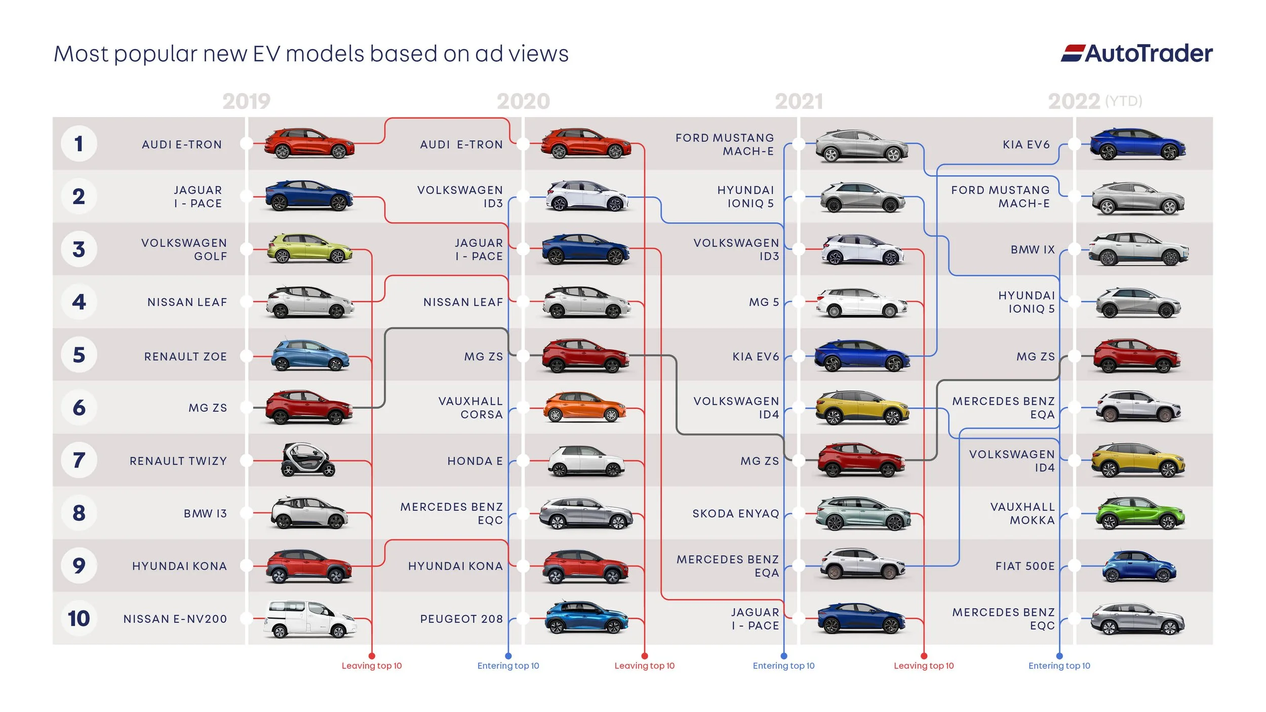 Although commanding a similarly premium price tag (the average new EV costs circa 35% more than a petrol or diesel equivalent), the premium marques are losing out to their volume competitors, making up four of the top five most in demand electric cars on our platform. Kia is setting the pace with its instantly iconic EV6, which is not only the most popular electric vehicle on the marketplace, appearing in more buyer shortlists than any other brand (and over twice as many as the similarly priced BMW 3 Series), but it is currently the most in demand of any fuel type. It’s equally iconic South Korean stablemate, the Hyundai IONIQ 5, is ranked the fourth most popular EV on Auto Trader, which has the largest amount of EVs available on its site.