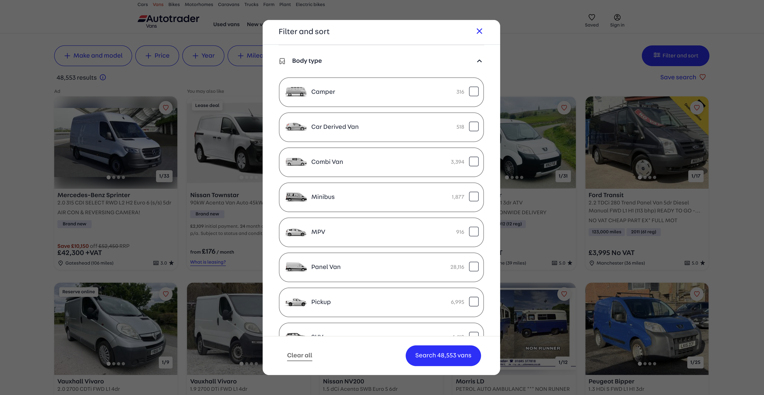 When implementing updated filters and descriptions, we paid close attention to the unique needs of each non-car vehicle category. For example, the van body type filter now includes illustrative images to help less experienced users understand their options more clearly. This approach was also applied to criteria such as wheelbase, cab type, and more.