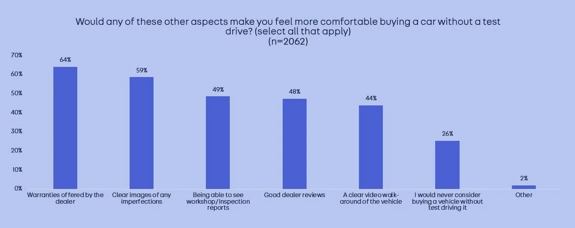 We also asked customers what else would make them more comfortable buying without a test drive, with 64% selecting warranties offered by the dealer, 59% stating clear images of any imperfections, and 49% saying workshop inspection reports³.
