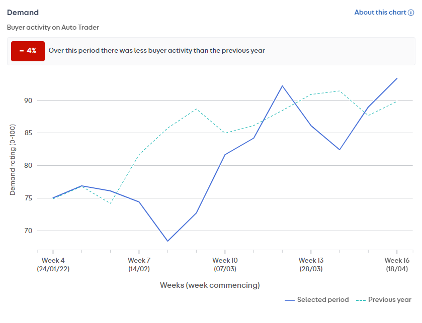 2 Auto Trader Market Insight data, Comparing Mon 24 Jan 2022 - Sun 24 Apr 2022 vs Mon 25 Jan 2021 - Sun 25 Apr 2021