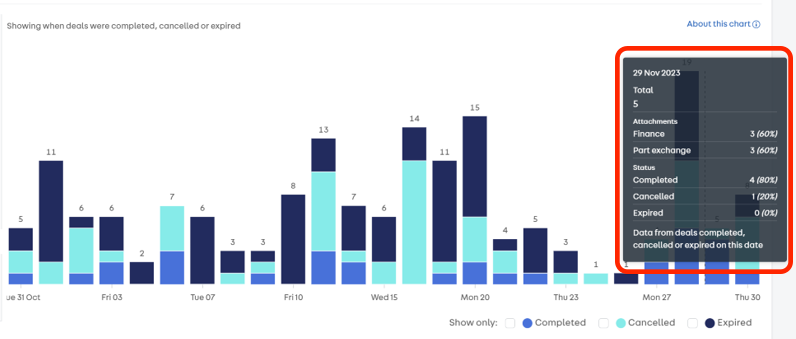 Get a breakdown of both submitted and concluded deals , split by attachment, deal status and conversions.